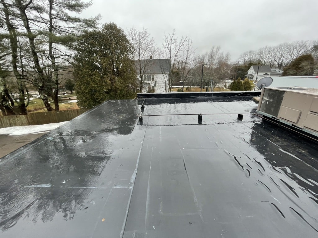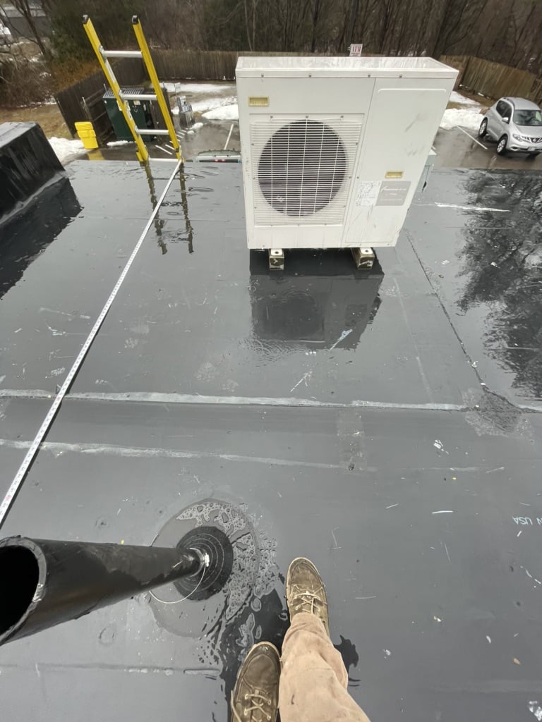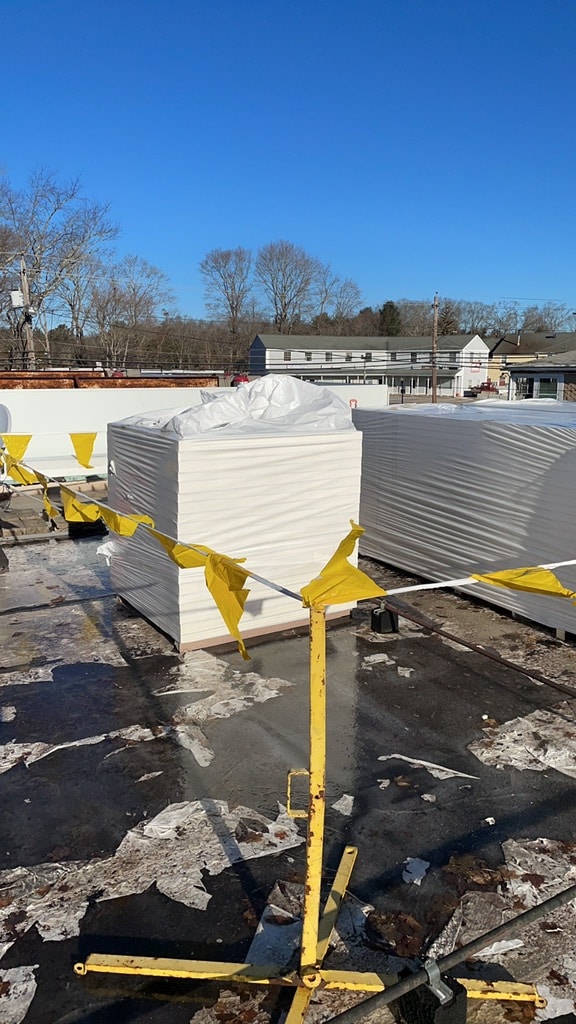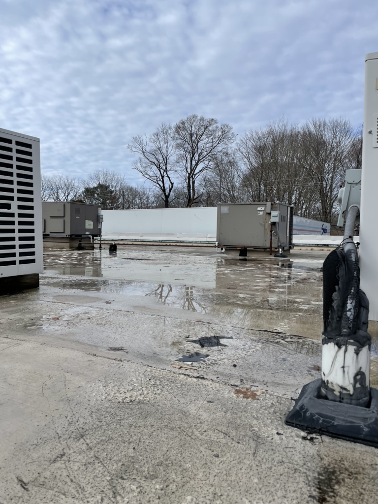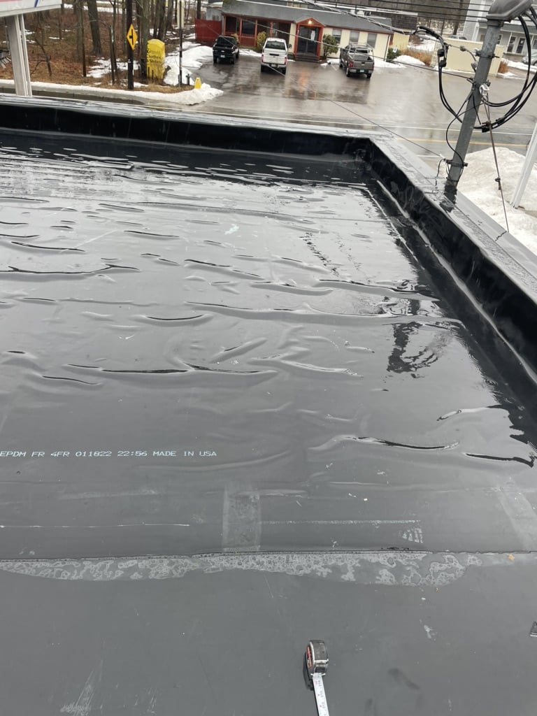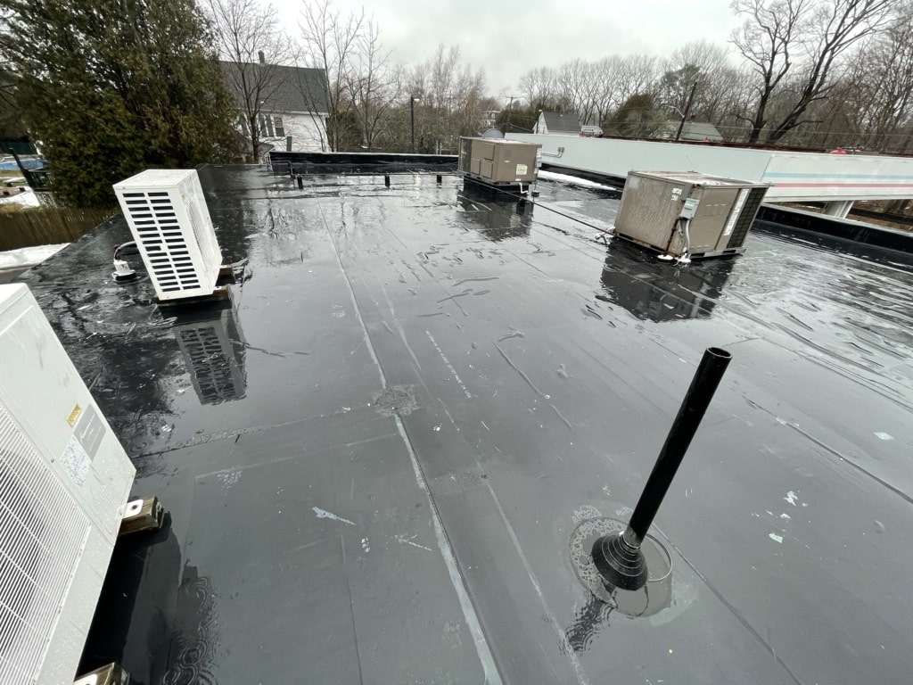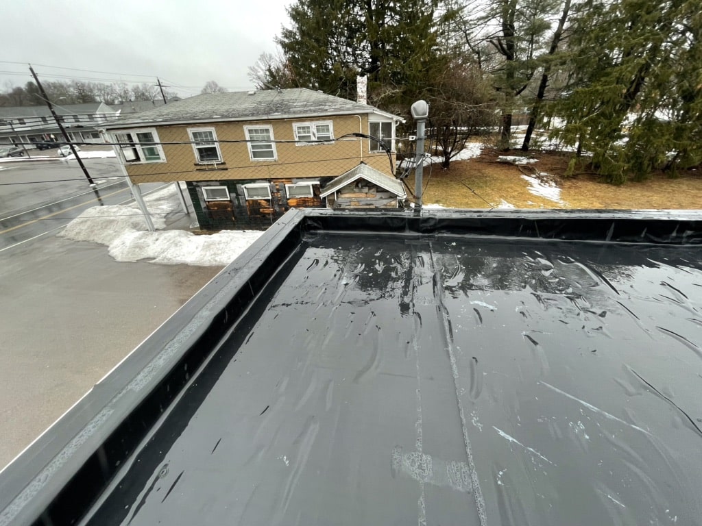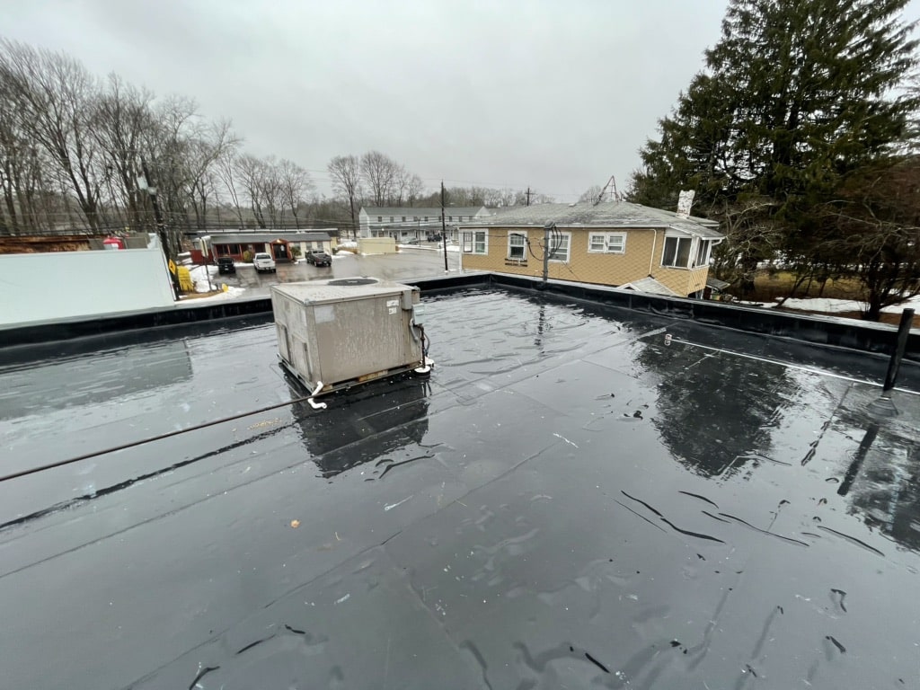 Pawcatuck Roofing Co. completed a commercial EPDM roof replacement and installation in Ashaway, RI, with roof insulation and waterproofing — before and after.