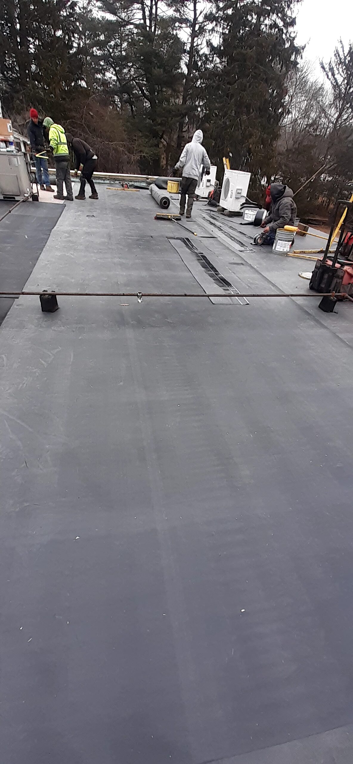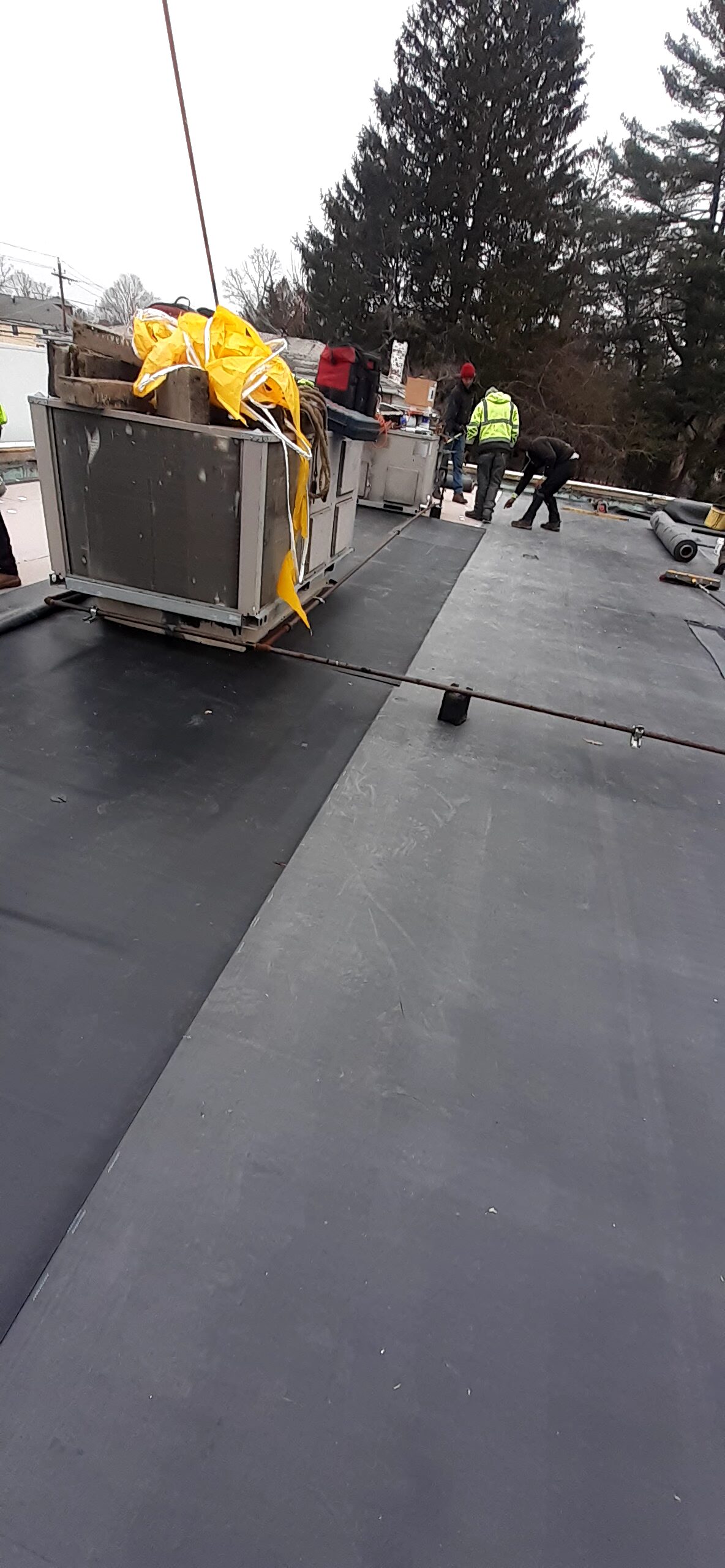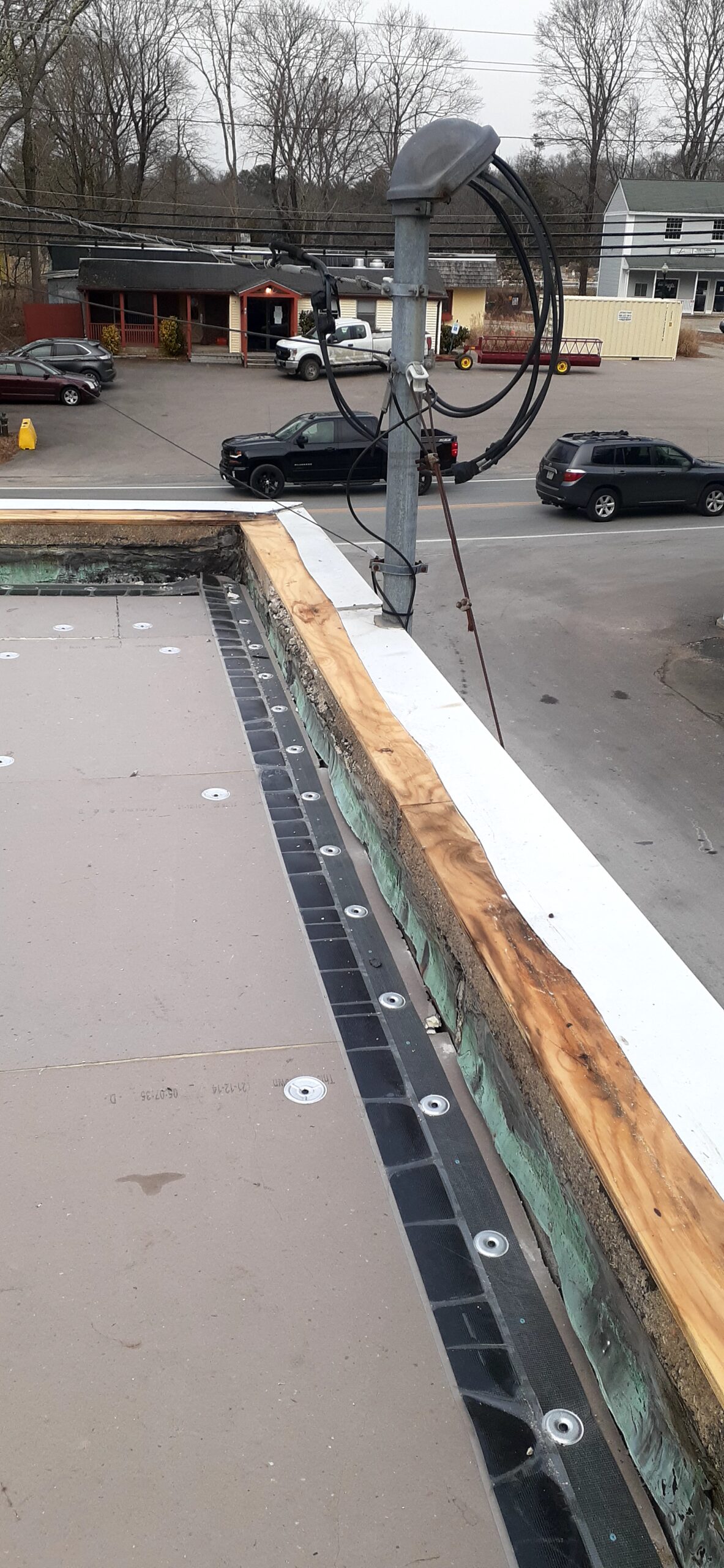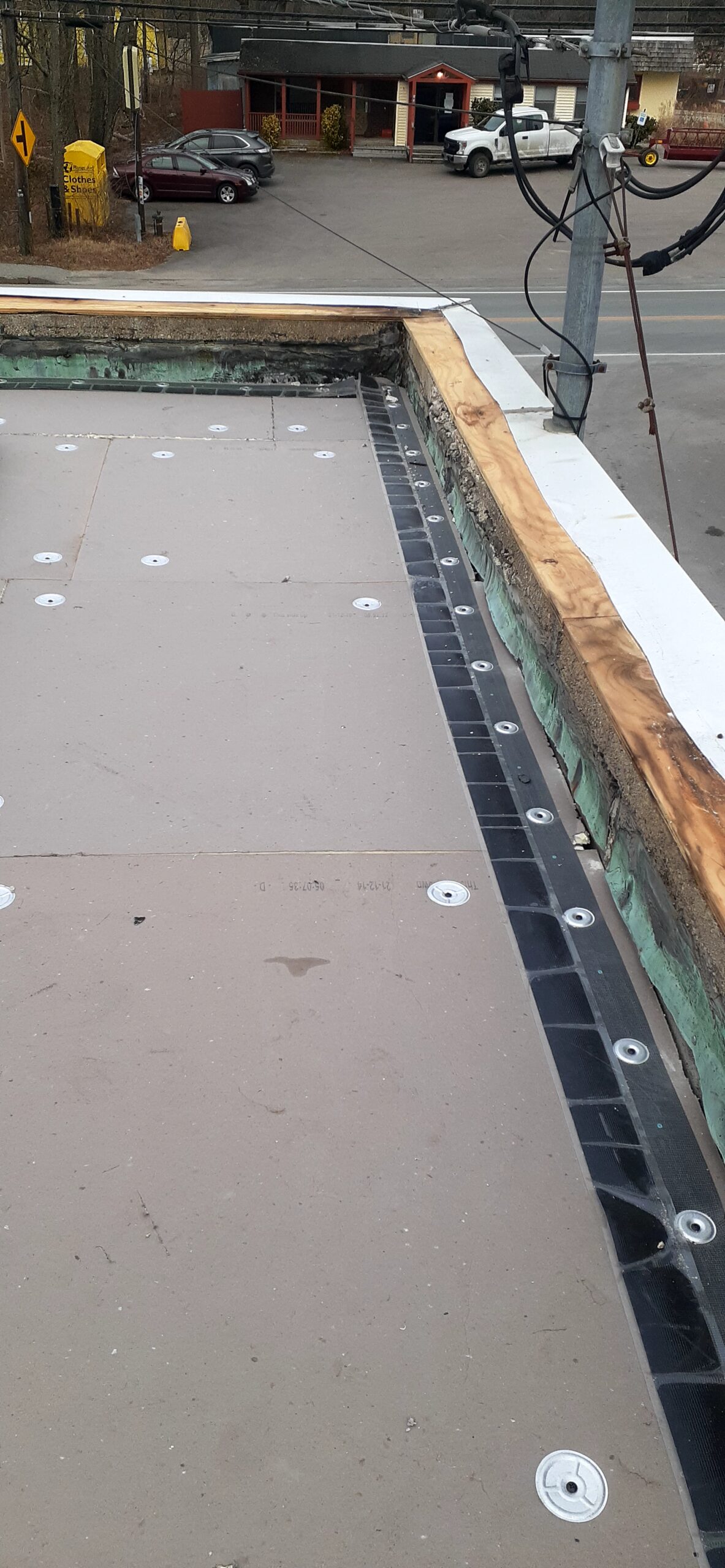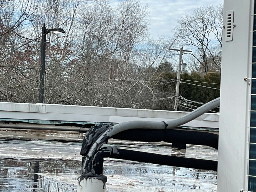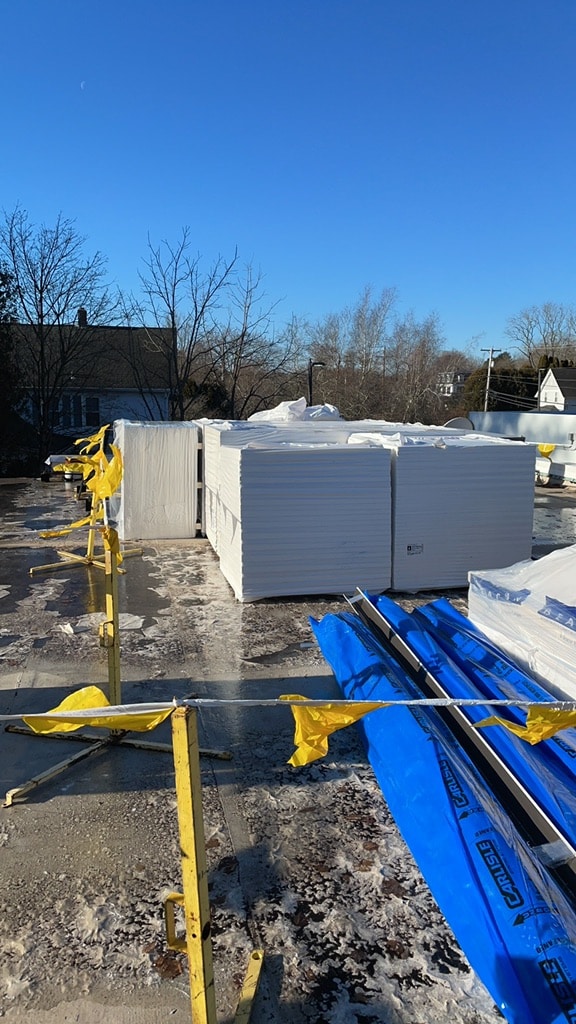 Pawcatuck Roofing Co. completed a commercial EPDM roof replacement and installation in Ashaway, RI, with roof insulation and waterproofing — before and after.