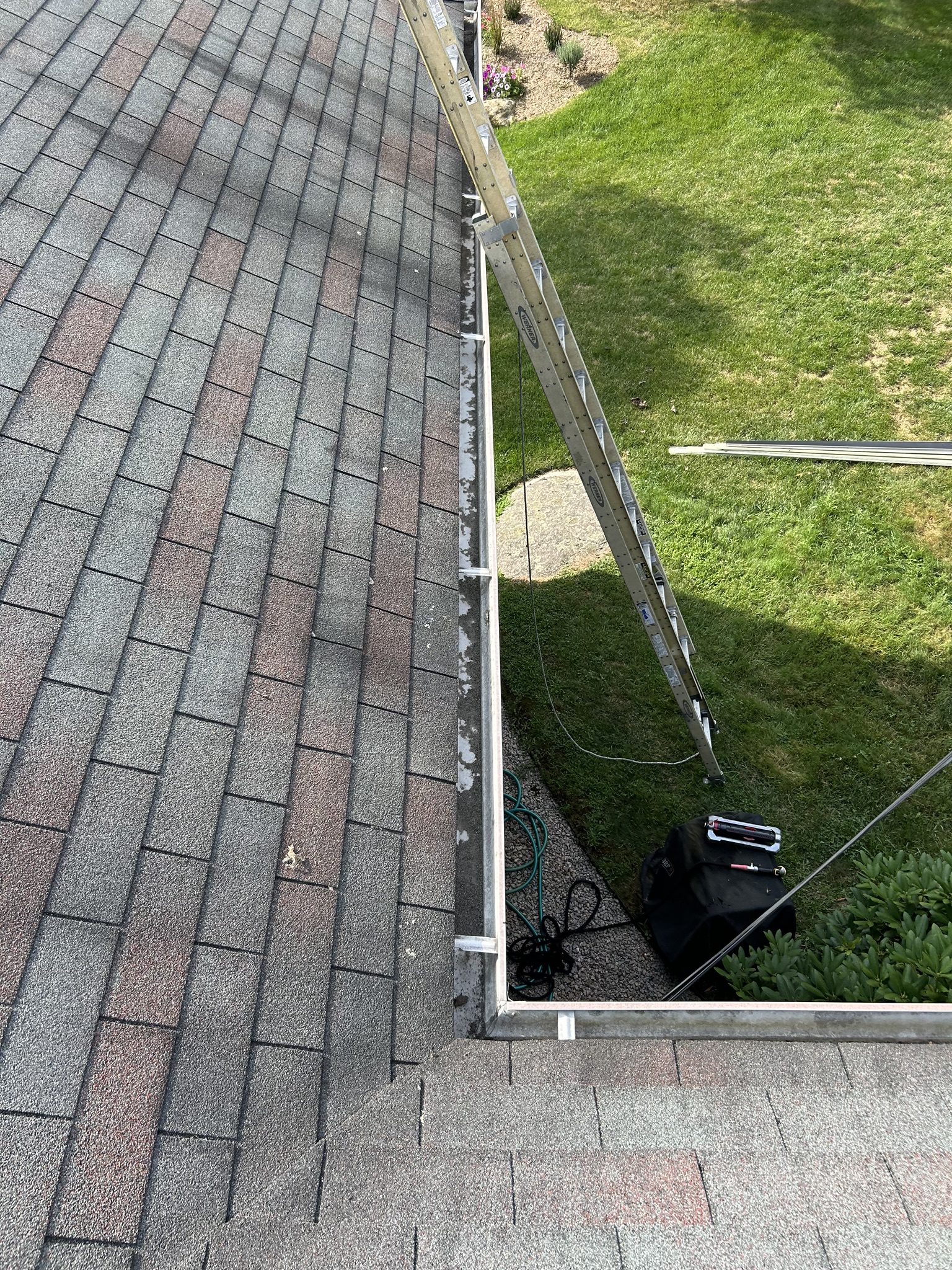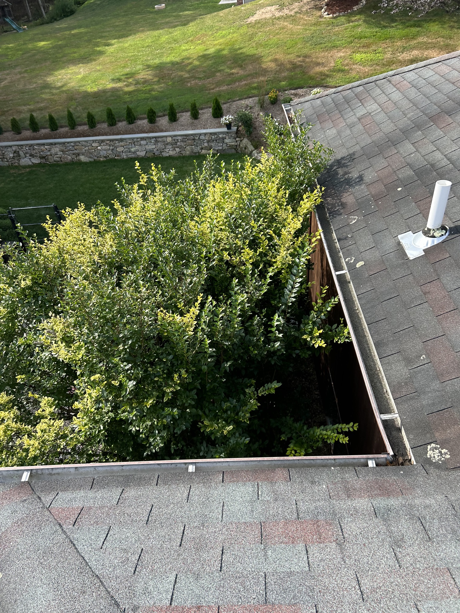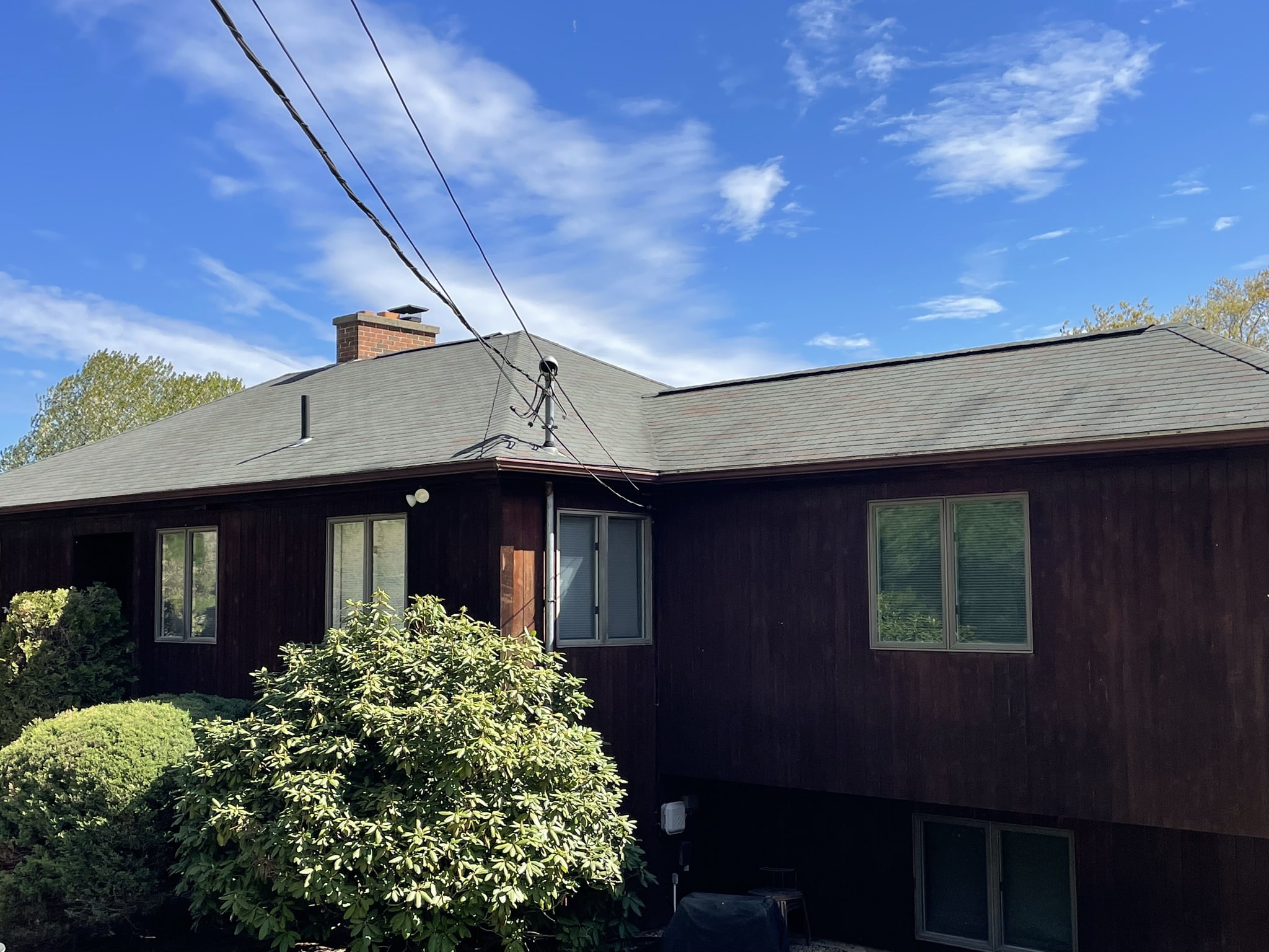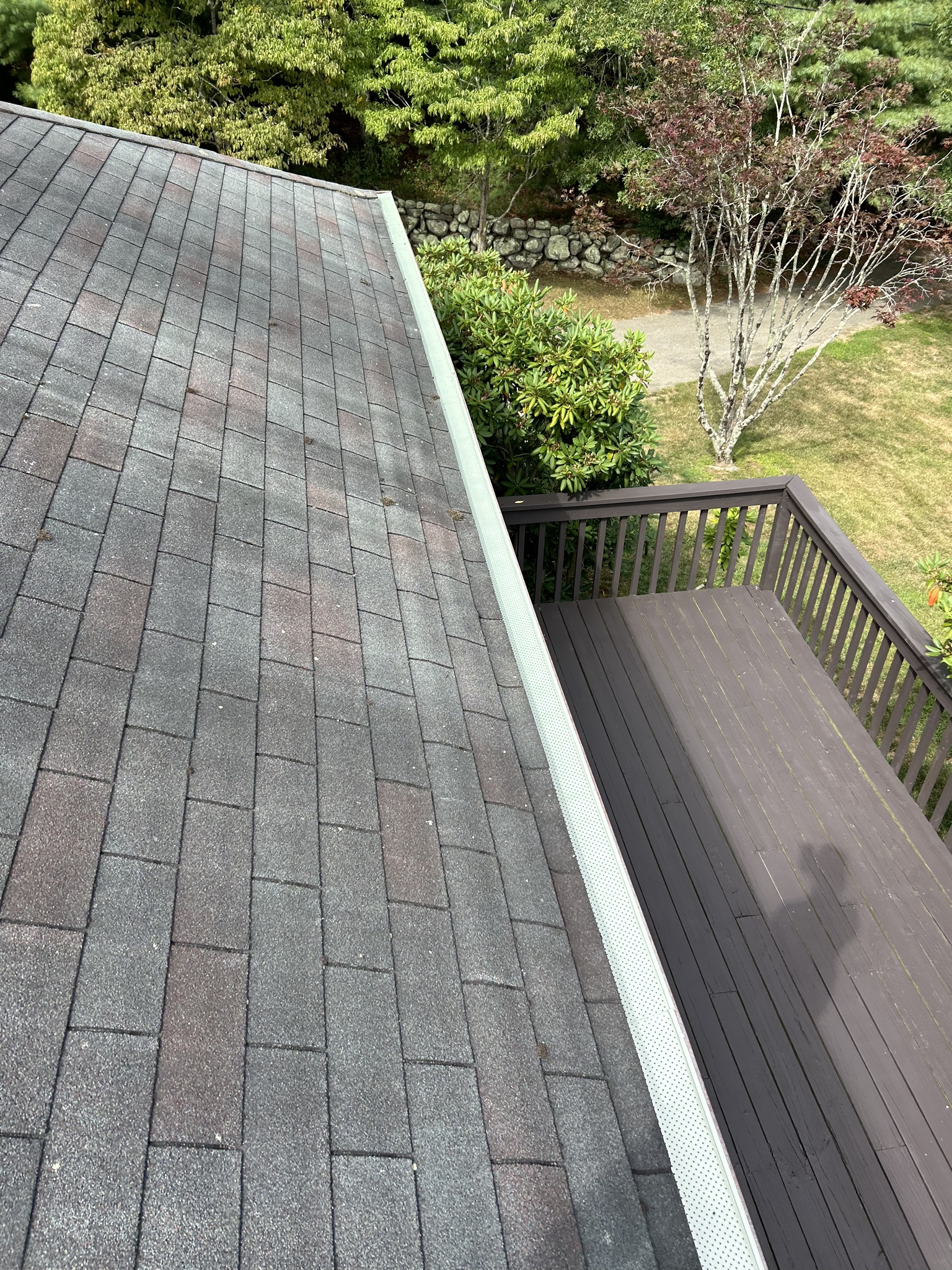 Before and after photos of a reroofing, gutter cleaning, and leaf guard installation project completed by Pawcatuck Roofing Co. in Westerly, RI. The team installed a new roof, cleaned existing gutters, and added leaf guards to improve drainage efficiency and protect the home from debris buildup.