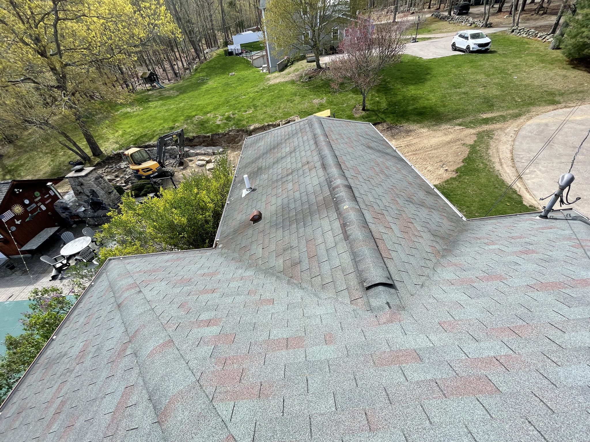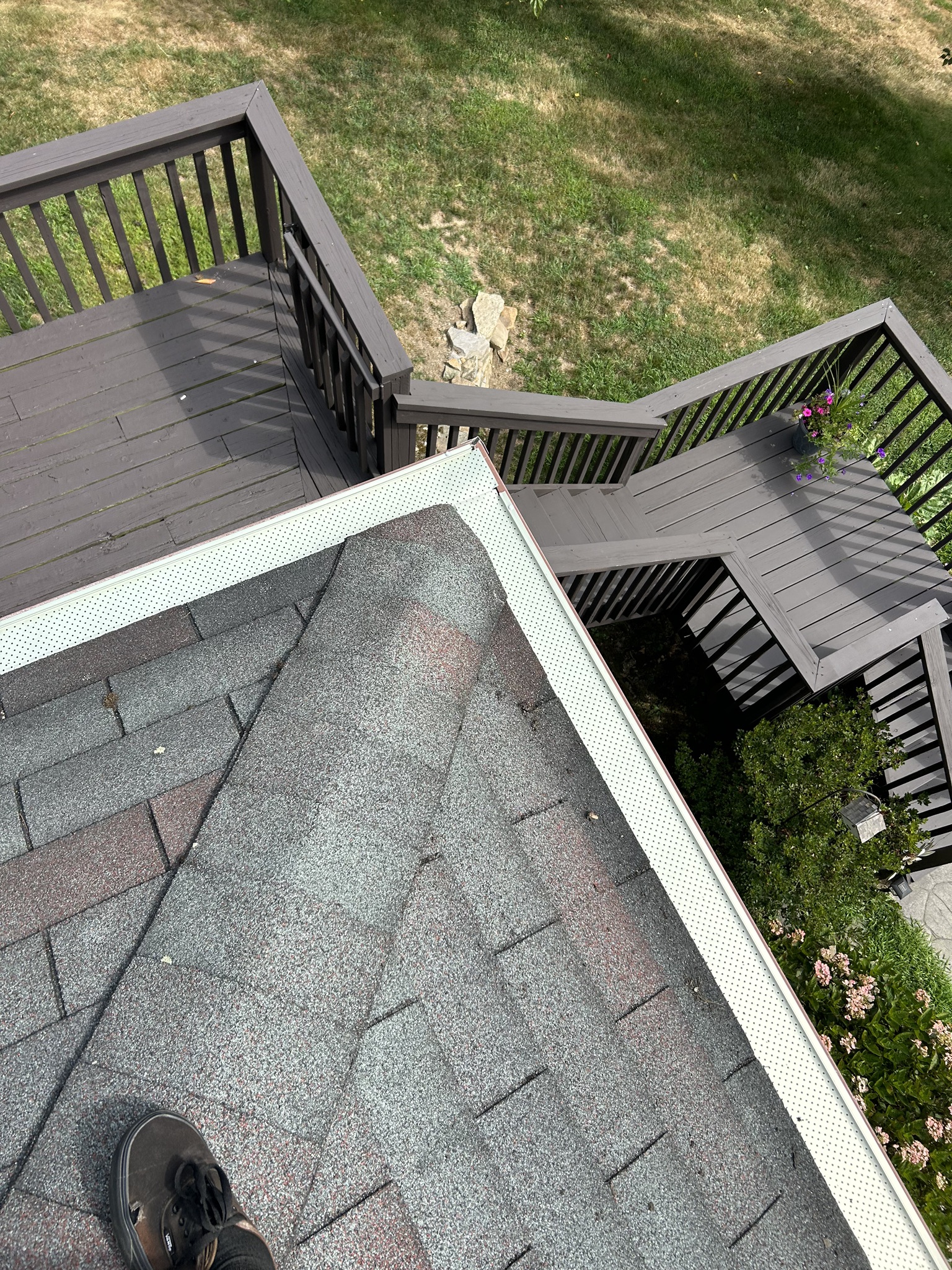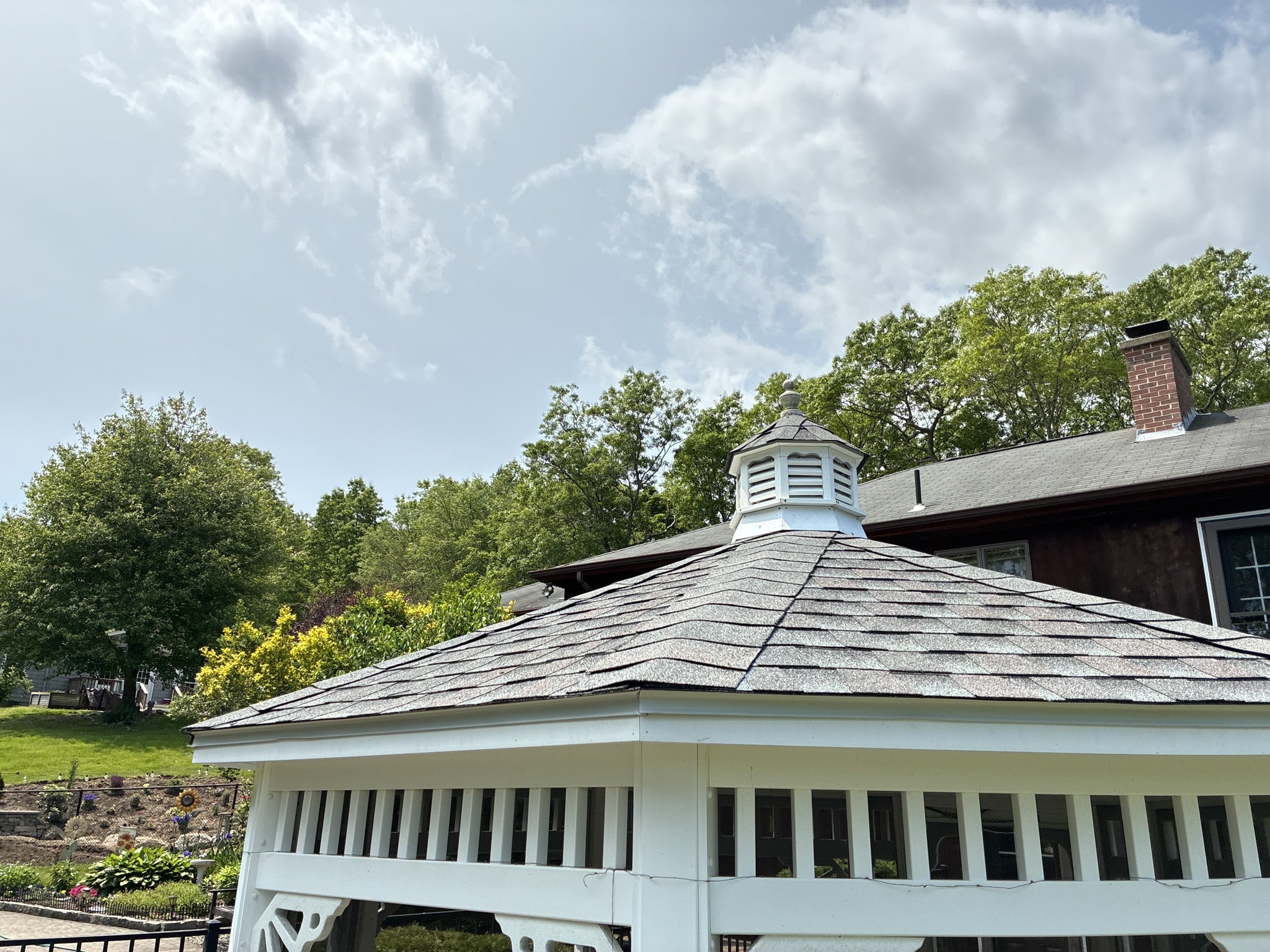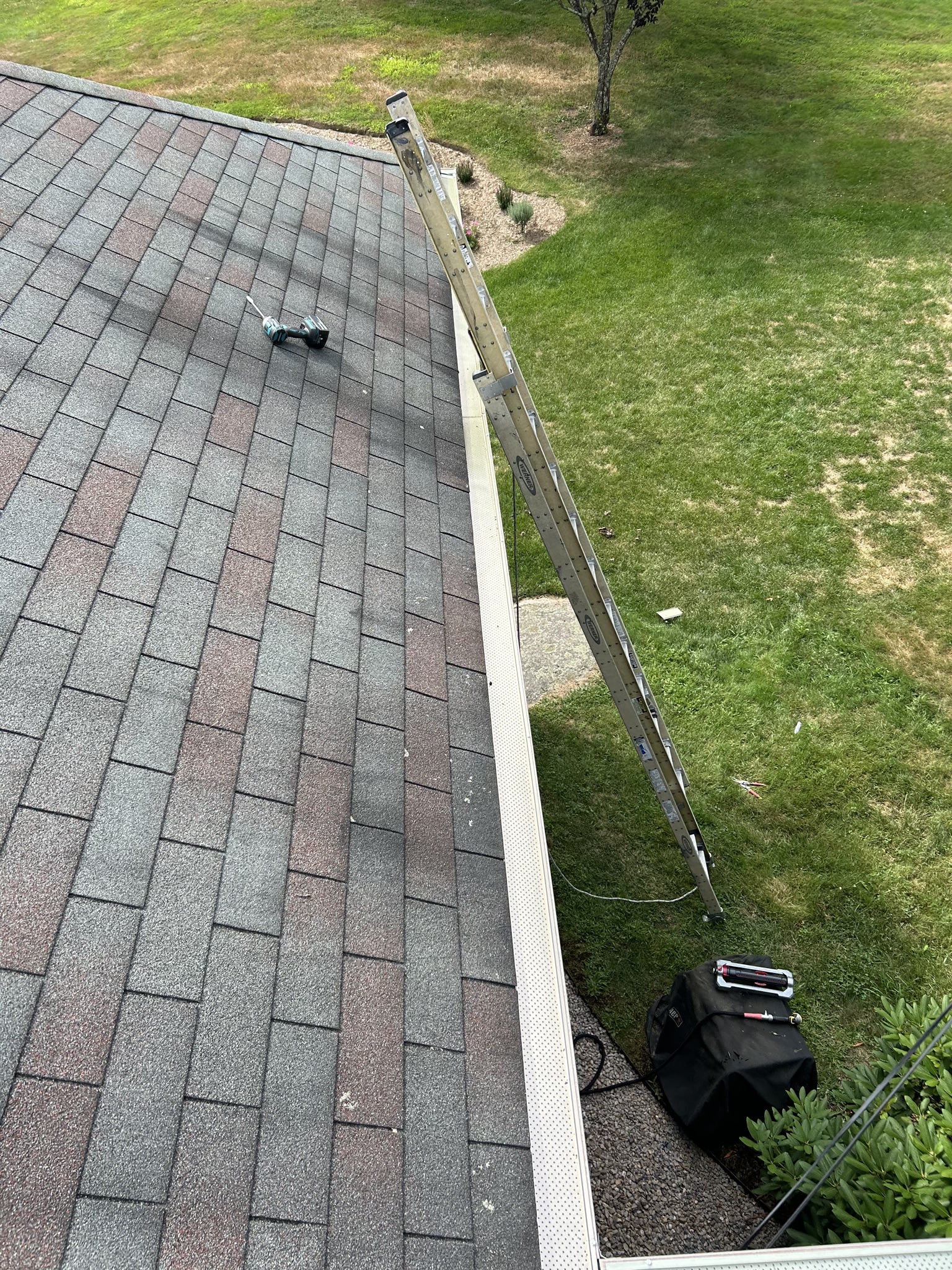 Before and after photos of a reroofing, gutter cleaning, and leaf guard installation project completed by Pawcatuck Roofing Co. in Westerly, RI. The team installed a new roof, cleaned existing gutters, and added leaf guards to improve drainage efficiency and protect the home from debris buildup.