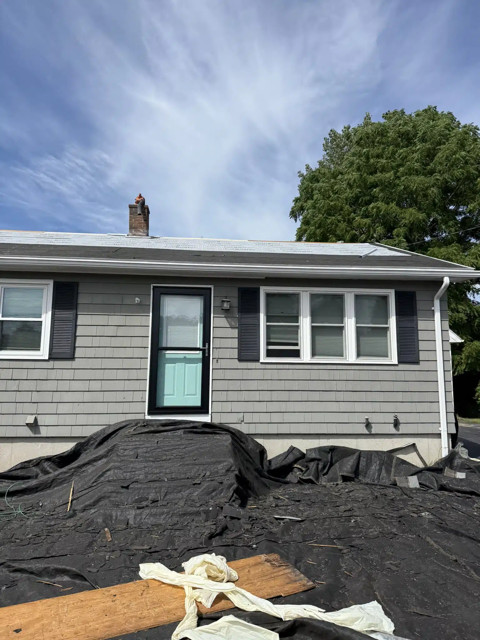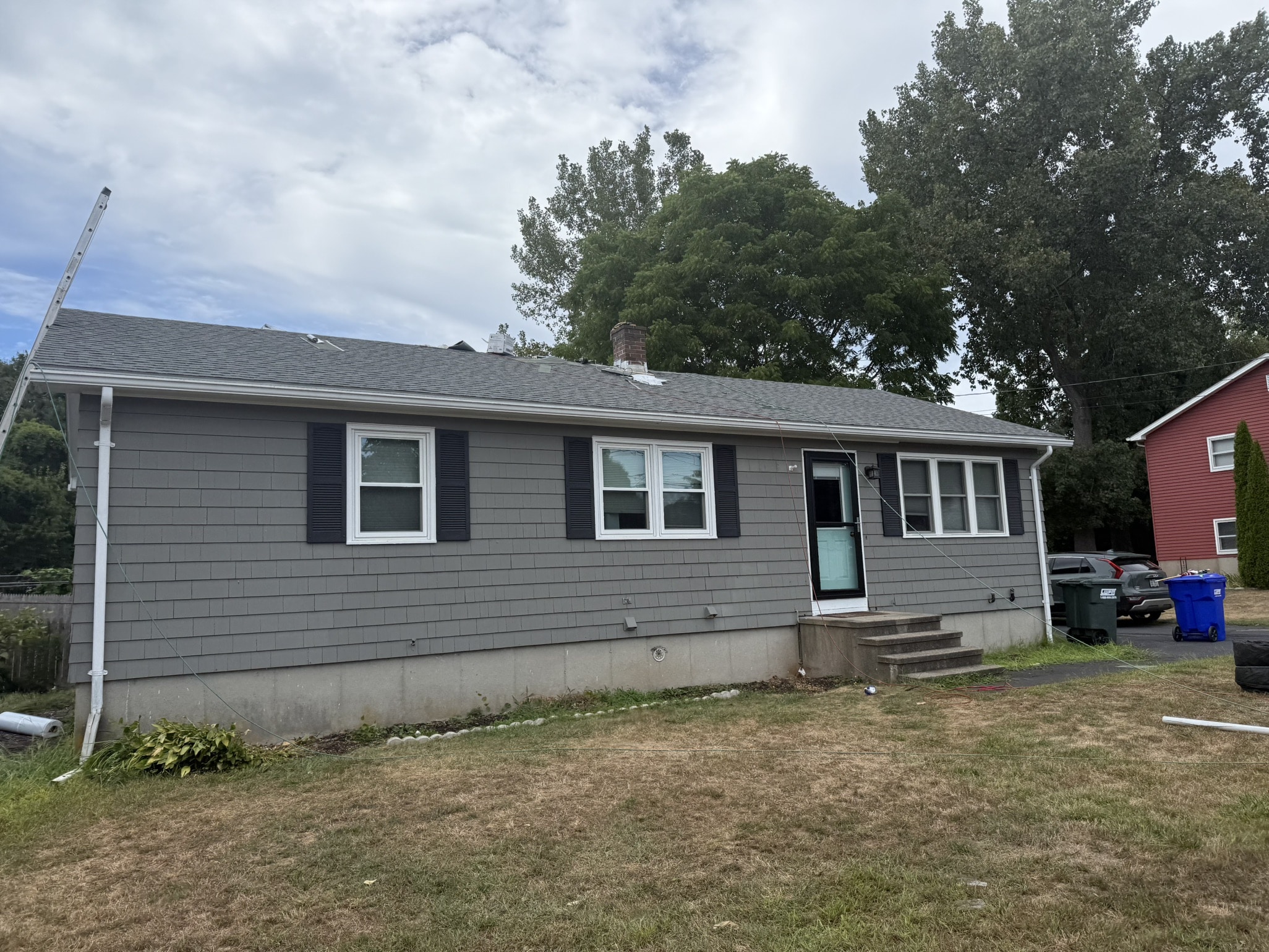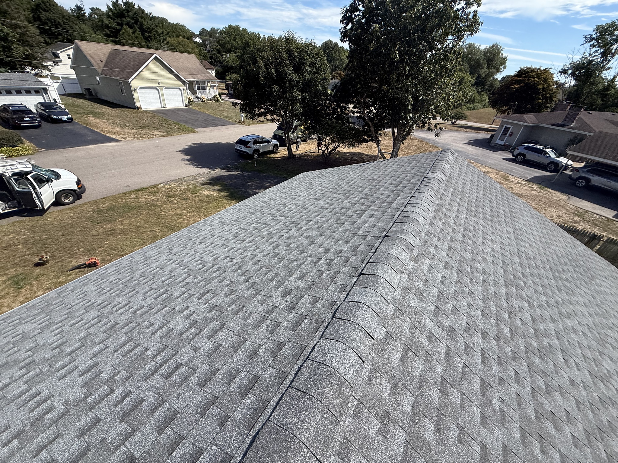 Pawcatuck Roofing Company completed a full residential roof replacement in Westerly, RI, featuring durable Pewter Gray GAF HDZ architectural shingles. This asphalt shingle installation not only enhances curb appeal but also provides long-lasting protection against the elements. See the transformation from the old roof to a sleek, modern finish.