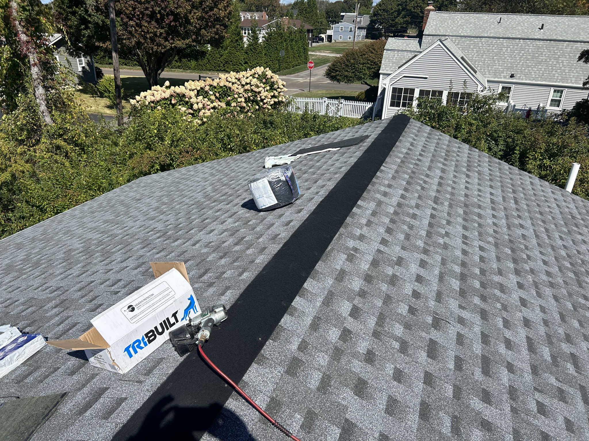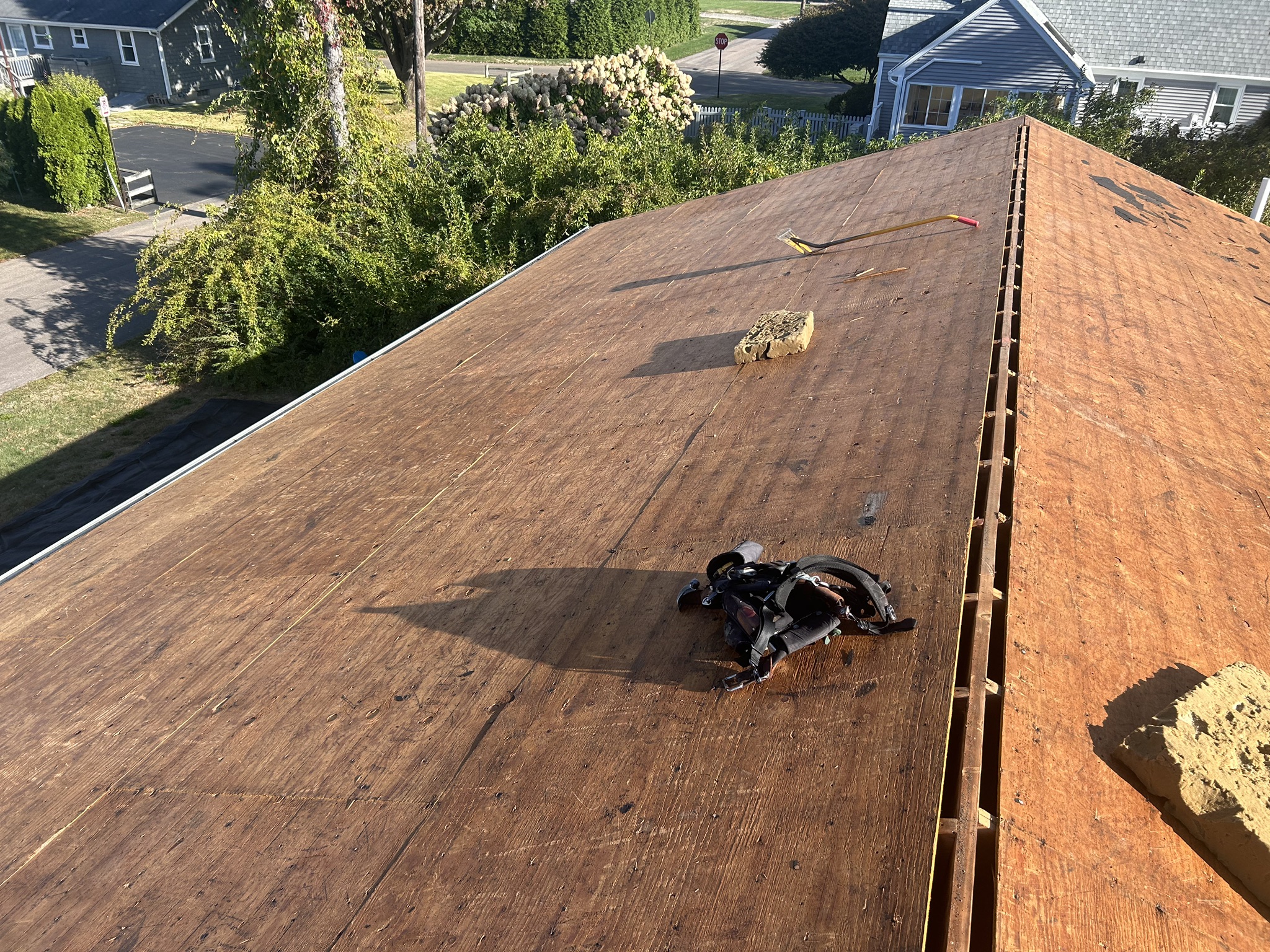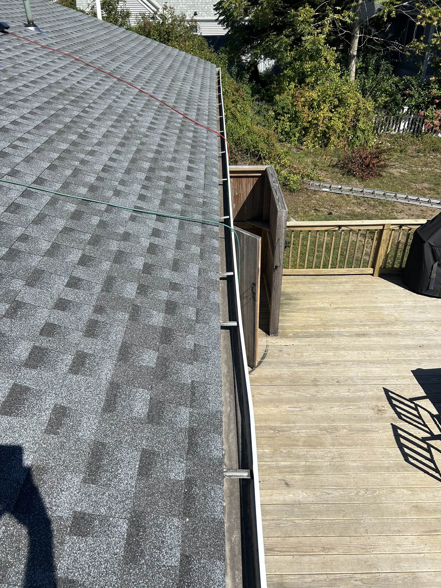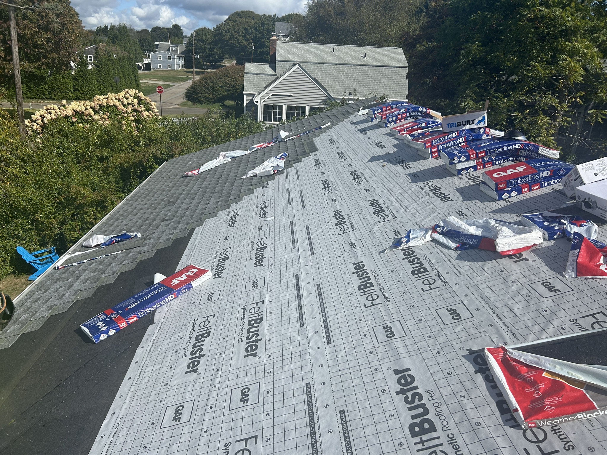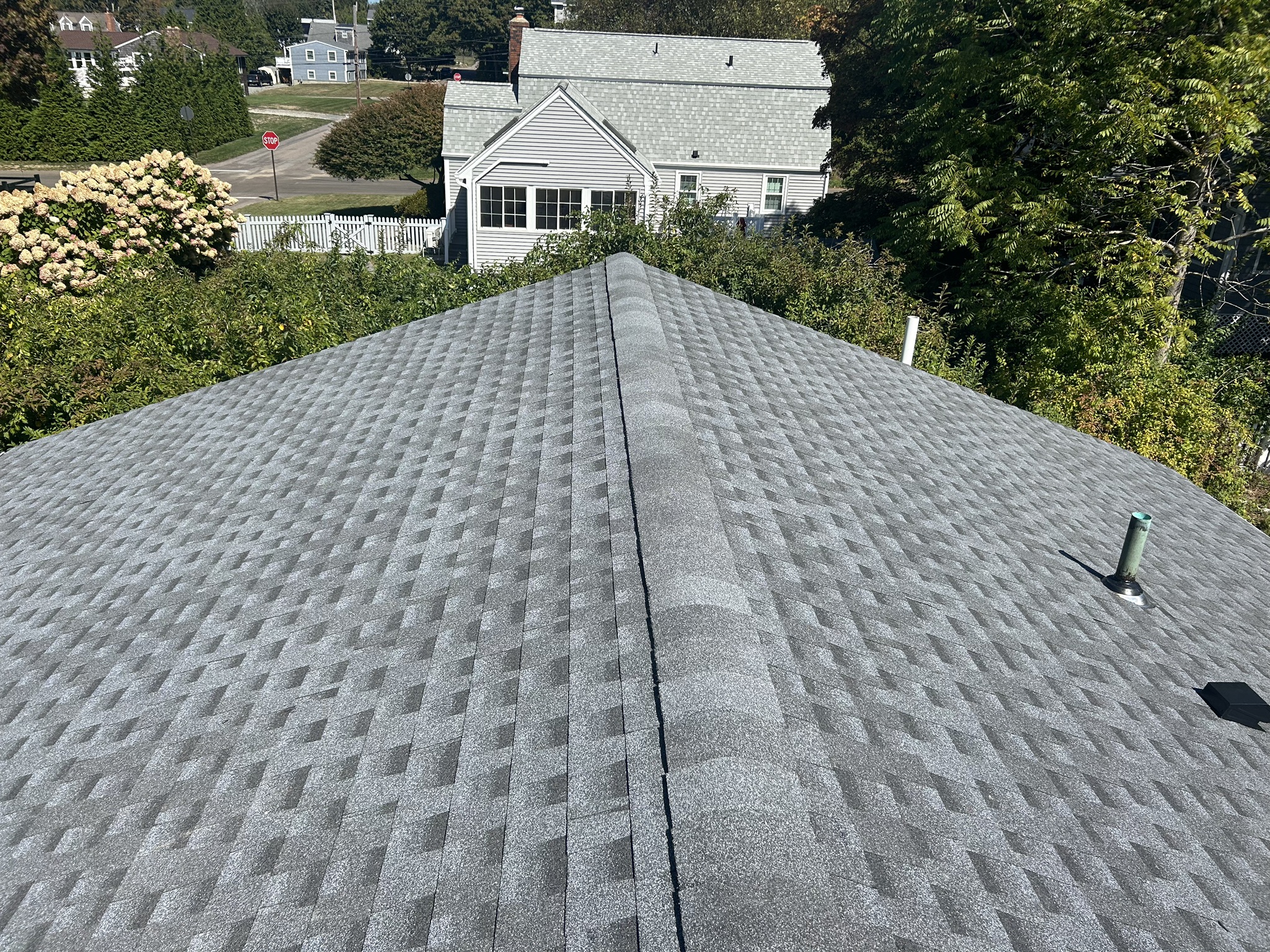 Before and after photos of a residential roof replacement completed by Pawcatuck Roofing Co. in Narragansett, RI. The team installed GAF Timberline HDZ Charcoal shingles, giving the home a clean, updated look and long-lasting protection against New England weather.
