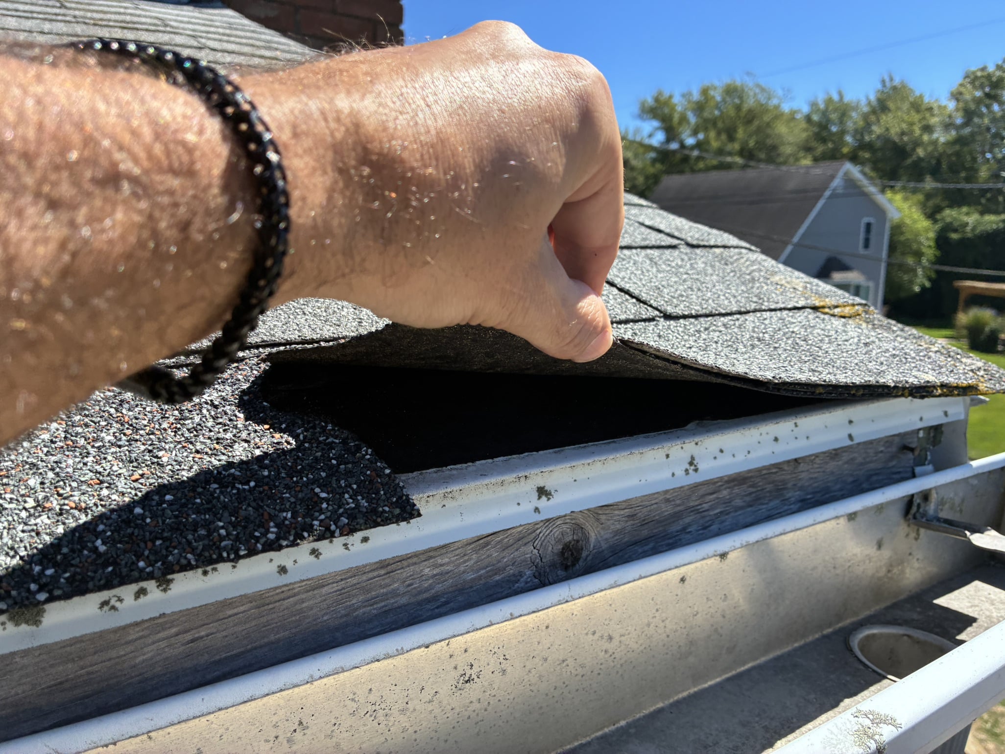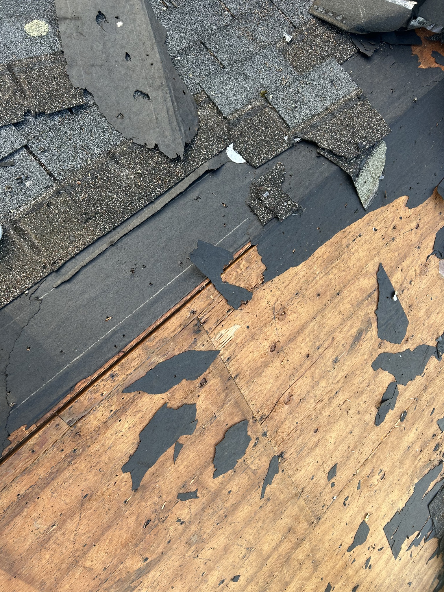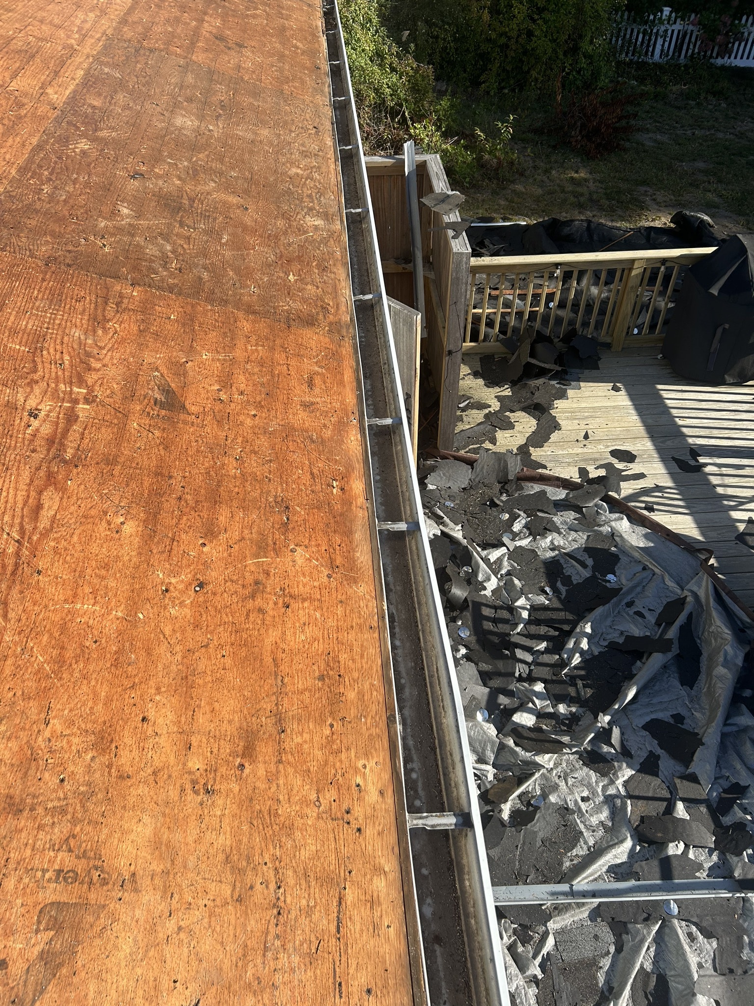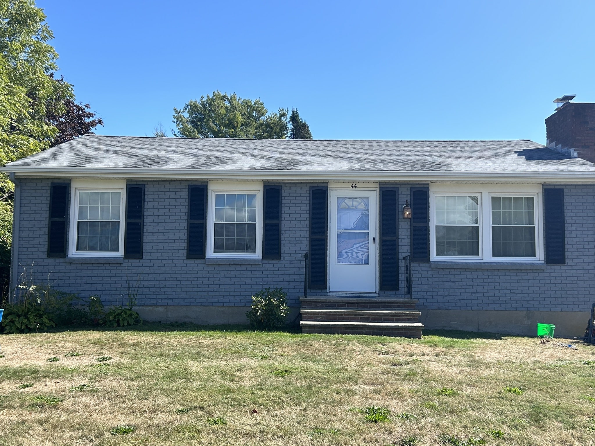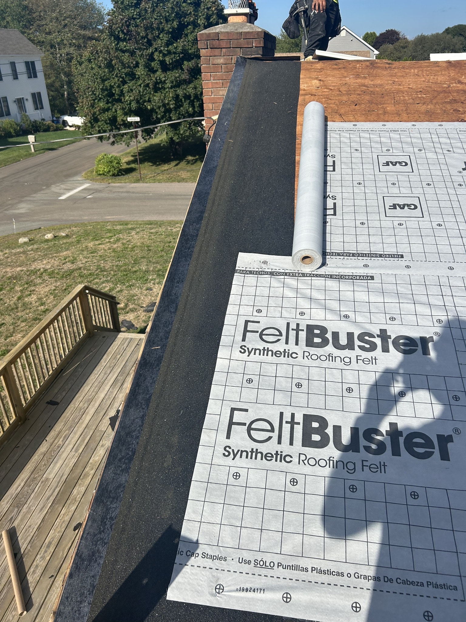 Before and after photos of a residential roof replacement completed by Pawcatuck Roofing Co. in Narragansett, RI. The team installed GAF Timberline HDZ Charcoal shingles, giving the home a clean, updated look and long-lasting protection against New England weather.