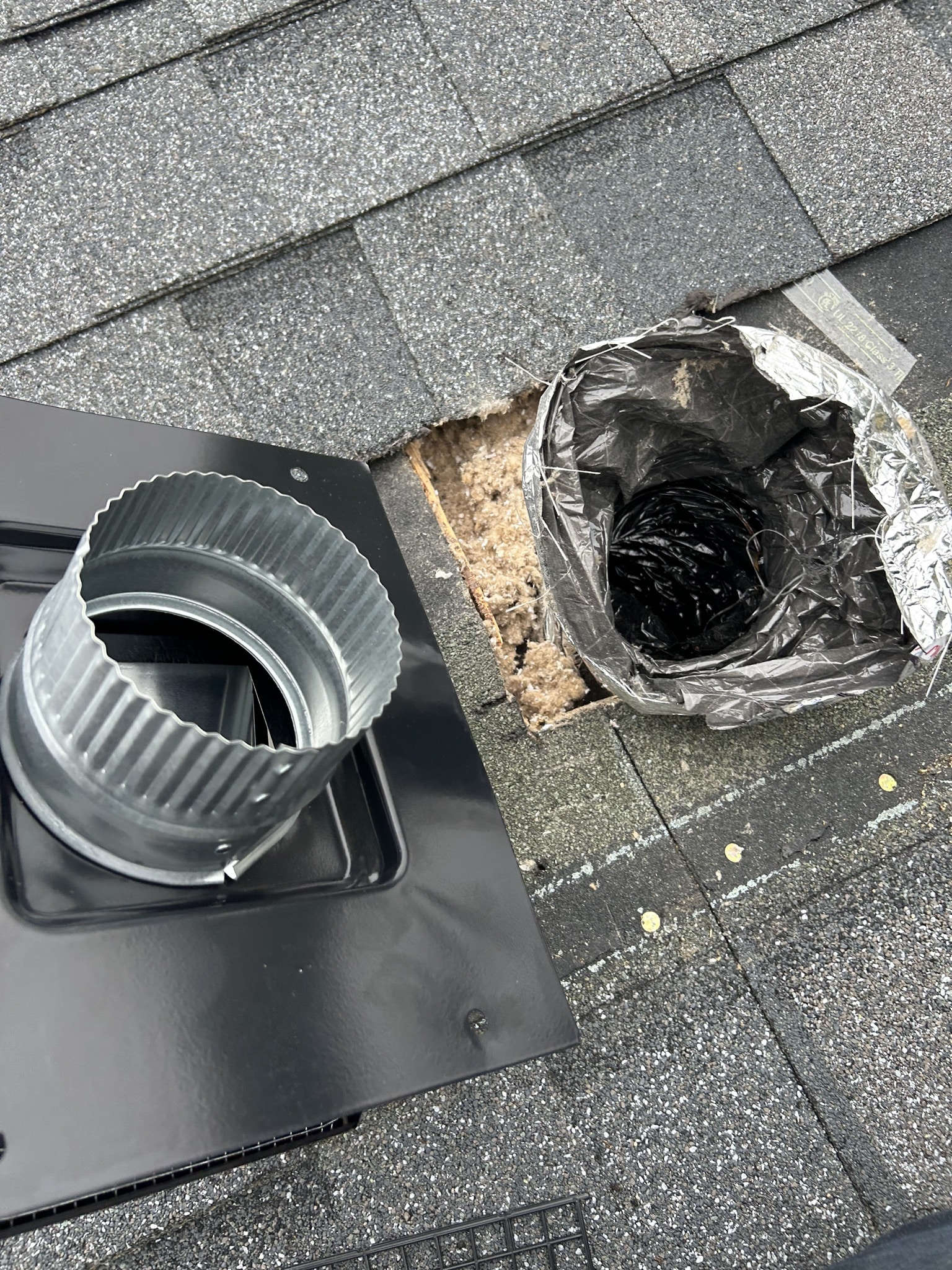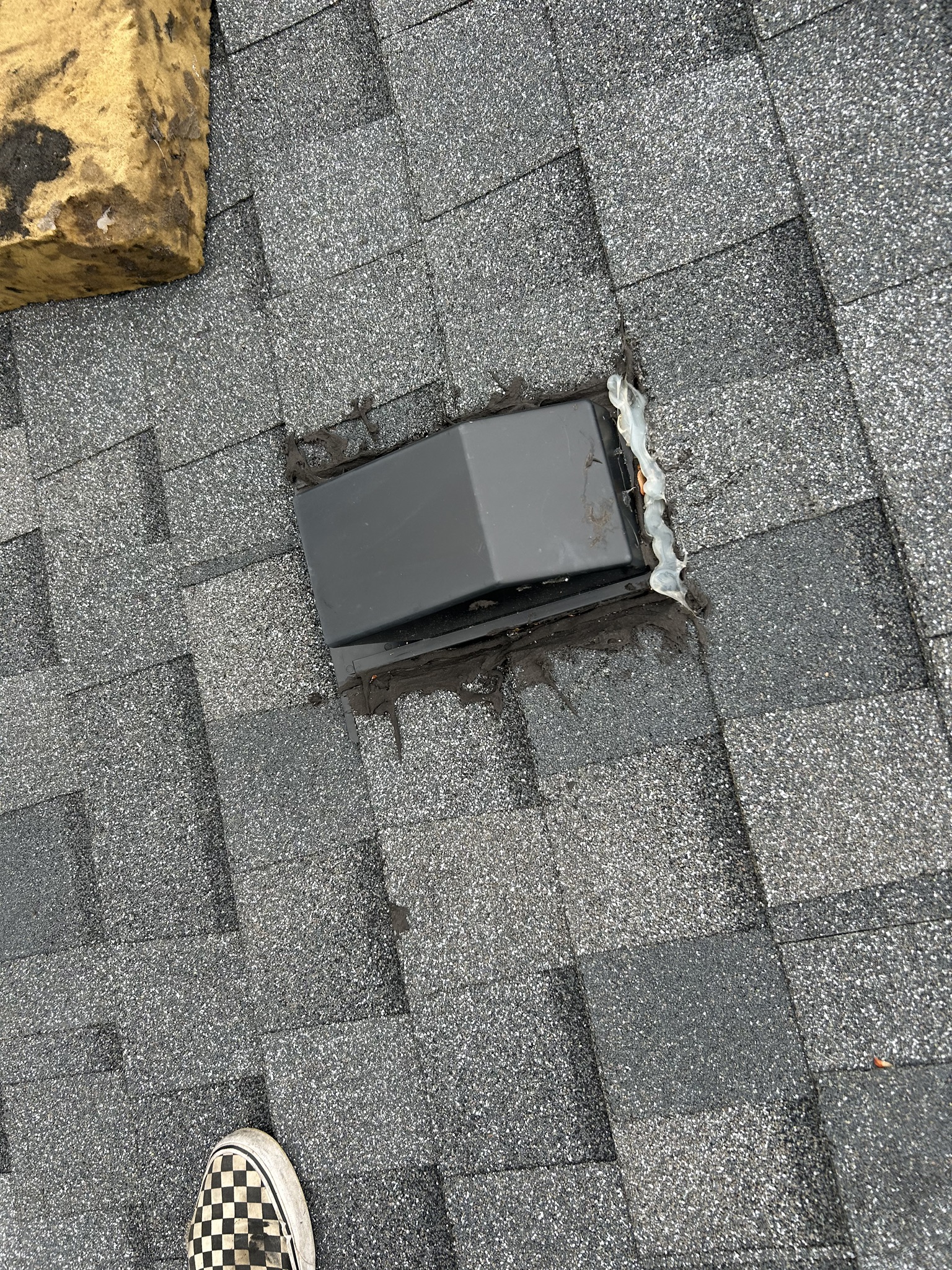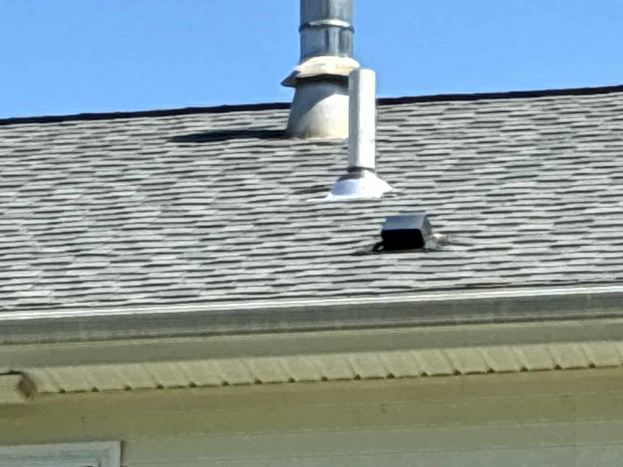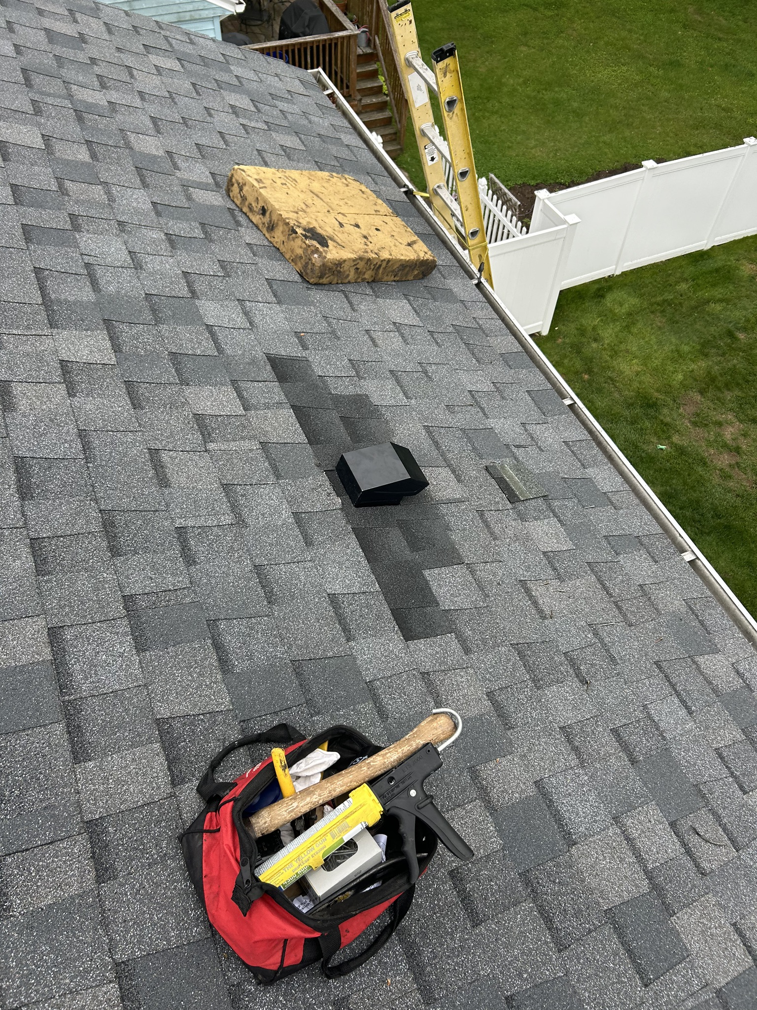 Before and after photos of a roof vent replacement and repair project completed by Pawcatuck Roofing Co. in Stonington, CT. The team replaced damaged roof vents and repaired surrounding areas to improve attic ventilation and ensure better roof performance and weather protection.