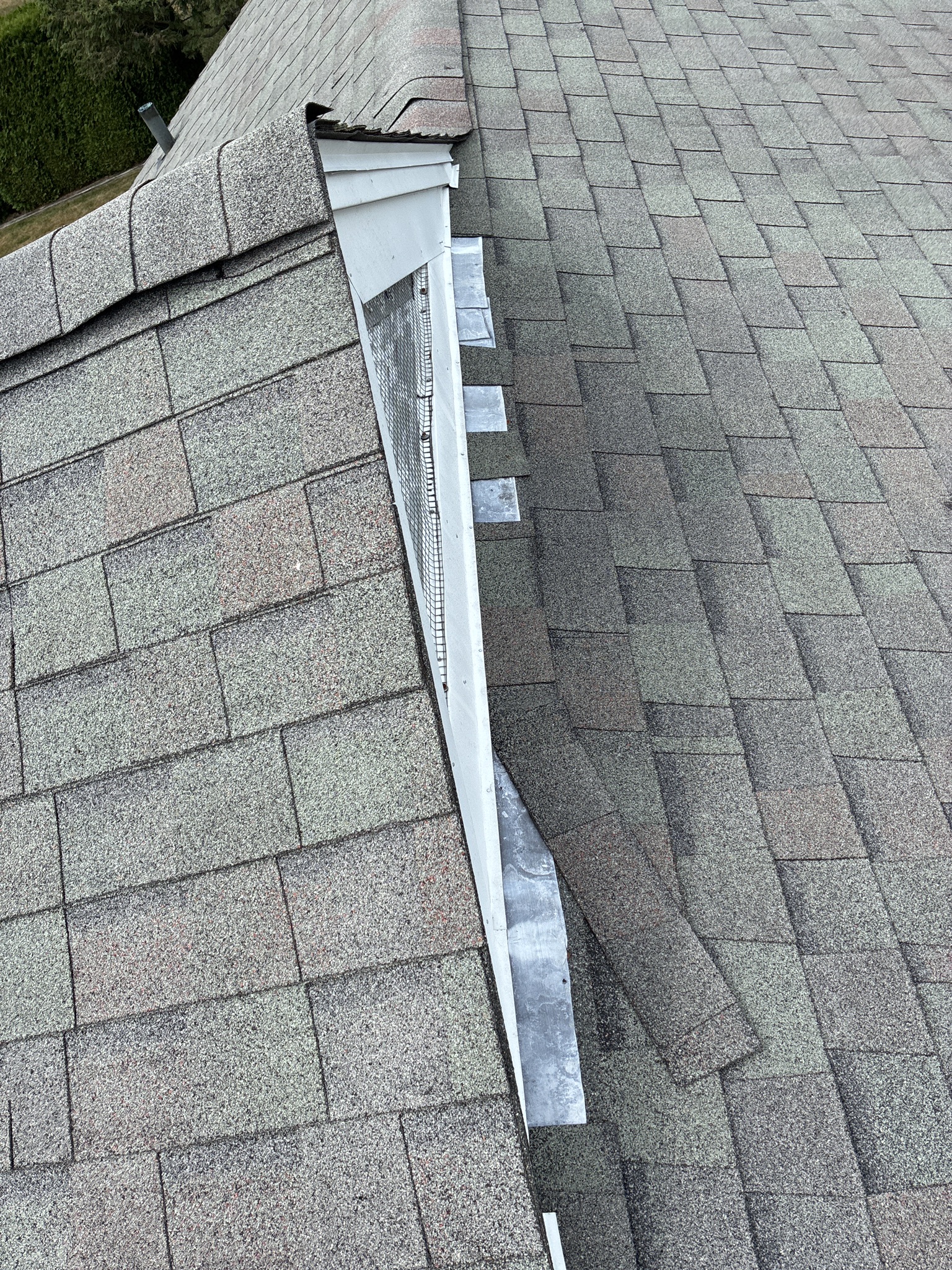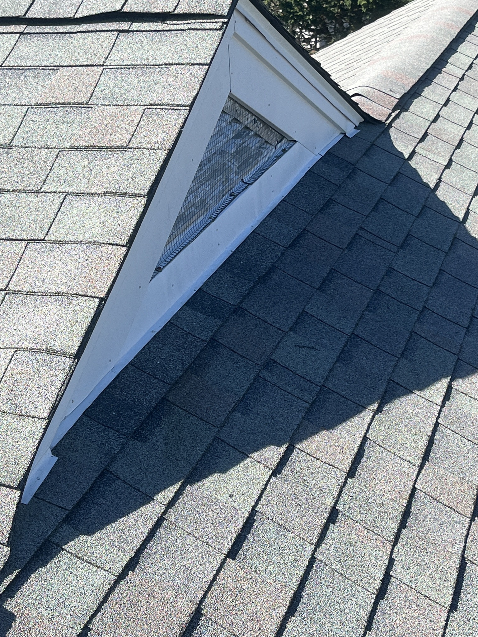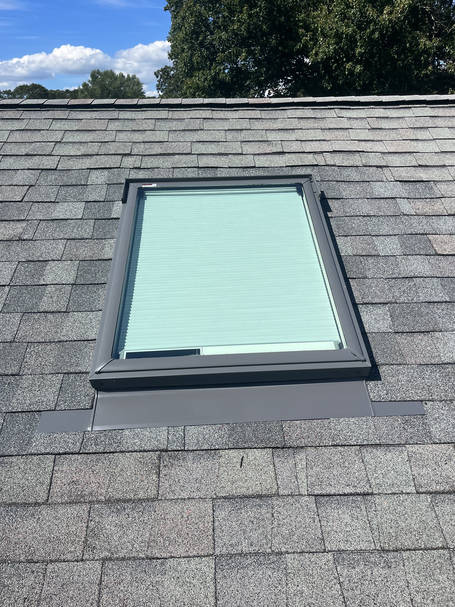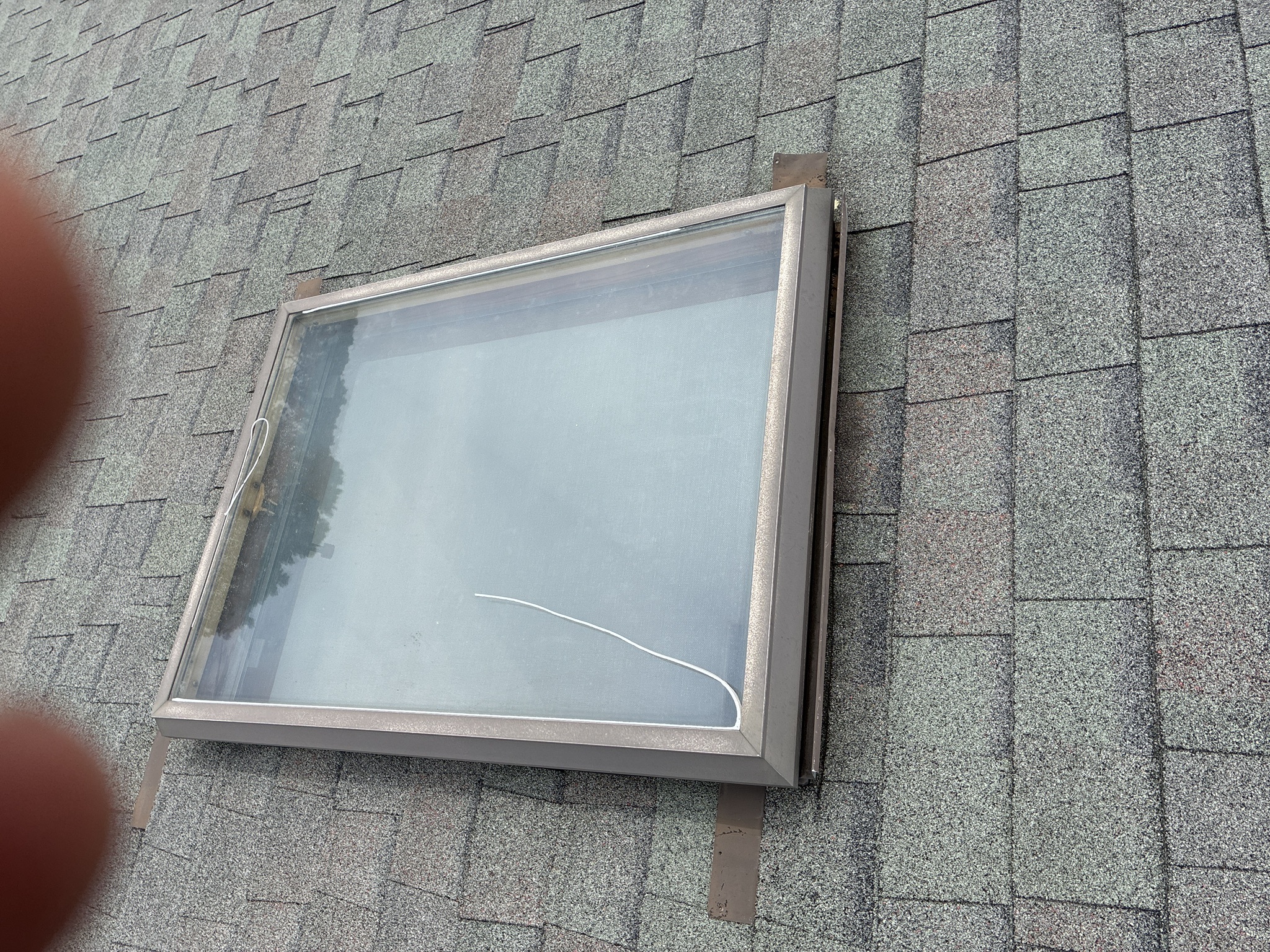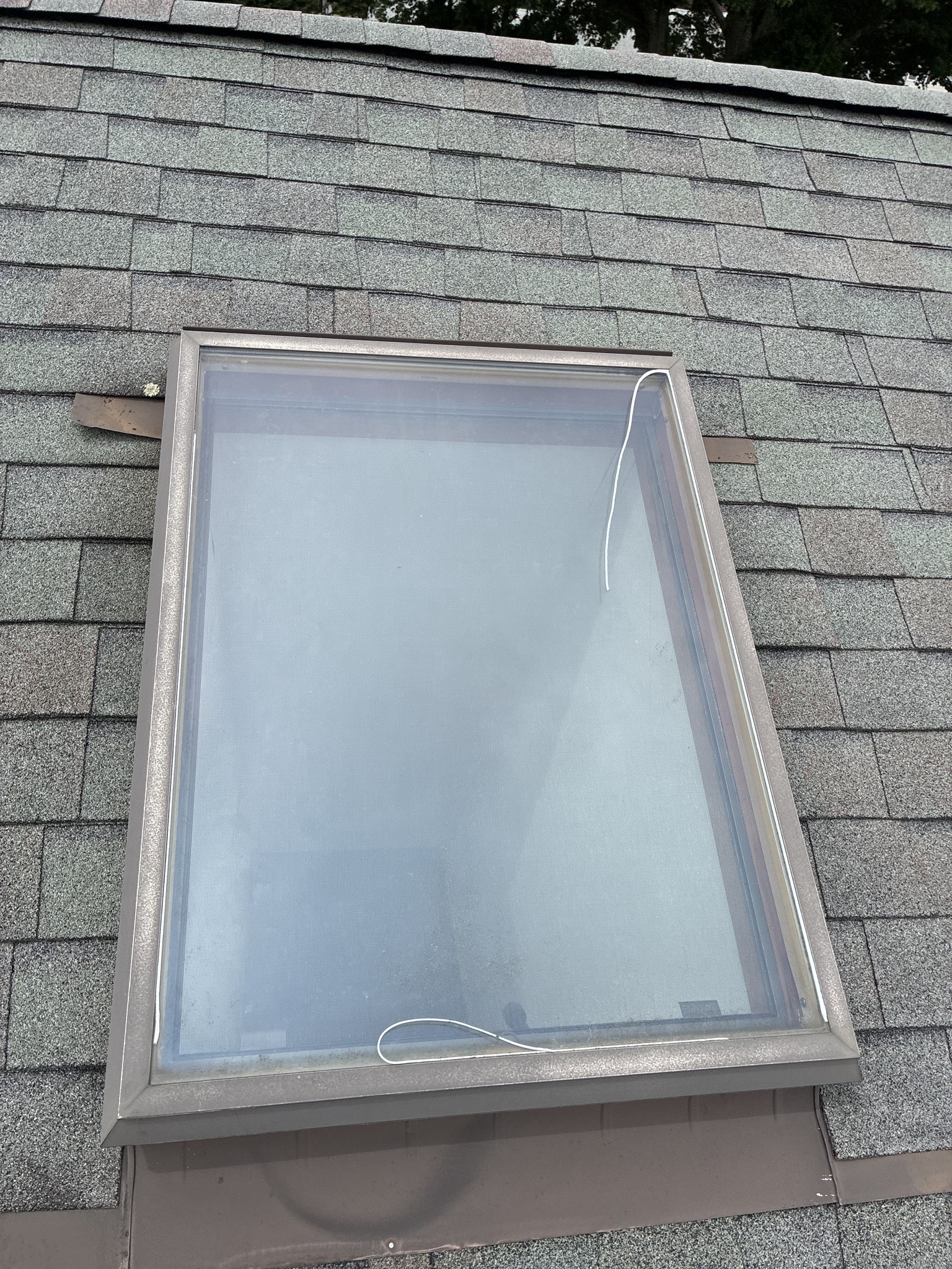 Before and after photos of a skylight replacement and roof repair project completed by Pawcatuck Roofing Co. in Westerly, RI. The team repaired damaged roofing and installed a new skylight to improve natural light and weather protection.